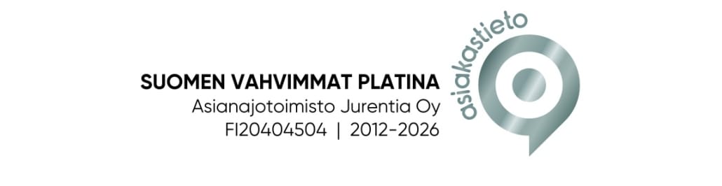Asianajotoimisto Jurentia on lukeutunut Asiakastiedon ylläpitämään Suomen Vahvimmat Platina– luokkaan yhtäjaksoisesti jo 15 vuoden ajan. Kanssamme olet pitkäjänteisen ja luotettavan yhteistyökumppanin seurassa.